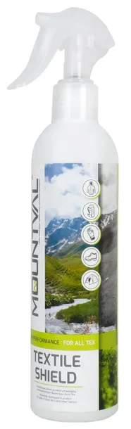 Textile Shield firmy Mountval to środek impregnujący wszelką odzież: kurtki, spodnie, czapki, rękawiczki, plecaki, a także specjalistyczną odzież górską.
