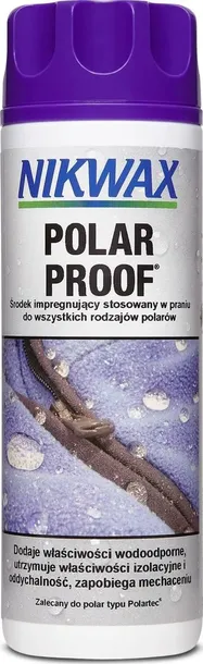 Nikwax Polar Proof® został specjalnie zaprojektowany i zoptymalizowany do odzieży polarowej: na pojedynczych włóknach pozostawia elastyczną warstwę hydrofobową, co pozwala oparom wilgoci przedostać się na zewnątrz, zachowując właściwości oddychające i optymalizując wydajność w deszczową pogodę. Ponadto, powstrzymuje plątanie się nitek polaru, przedłużając jego żywotność. Nikwax Polar Proof® szybko i łatwo aplikuje się w pralce, dzięki czemu środek przechodzi przez odzież. Wysoce wydajną, trwałą hydrofobowość (DWR) Nikwax Polar Proof® wytwarza się podczas suszenia na powietrzu. Dlatego nie ma potrzeby suszenia mechanicznego, co oszczędza energię.