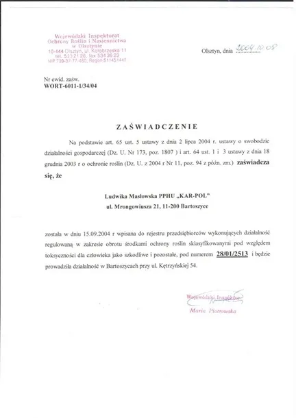Numer wpisu do rejestru WIORiN przedsiębiorcy wykonującego działalność gospodarczą w zakresie wprowadzania do obrotu środków ochrony roślin: 28/01/2513
