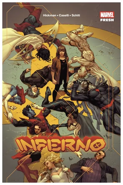 Przywódcy państwa mutantów na wyspie Krakoa prowadzili niebezpieczną grę z niebezpieczną kobietą, a teraz dosięgły ich konsekwencje. Była terrorystka Mystique była lojalna wobec Cichej Rady tylko z jednego powodu: obietnicy, że pewnego dnia Profesor X i Magneto ożywią jej ukochaną Destiny - mutantkę obdarzoną mocą prekognicji. Problem w tym, że Krakoa może istnieć tylko pod warunkiem, że nigdy nie postawi na niej stopy mutant zdolny przewidywać przyszłość. Co zrobi Mystique, gdy zorientuje się, że została wykorzystana? Czy utopijny kraj mutantów przetrwa, kiedy wyjdzie na jaw, że zbudowano go na kłamstwie?Inferno to emocjonujący event zamykający cykl Rządy X i otwierający cykl Przeznaczenie X. Kontynuacją przedstawionej w nim historii jest komiks Wolverine - X żywotów/X ś Inferno napisał Jonathan Hickman - mistrz pełnych rozmachu, drobiazgowo zaplanowanych opowieści, znany z Fantastycznej Czwórki i sagi o Avengers zakończonej Tajnymi wojnami. Rysunki stworzyli Stefano Caselli (Avengers, Marauders), Valerio Schiti (Tony Stark - Iron Man) i inni artyś zawiera materiały opublikowane pierwotnie w zeszytach Inferno #1-4.