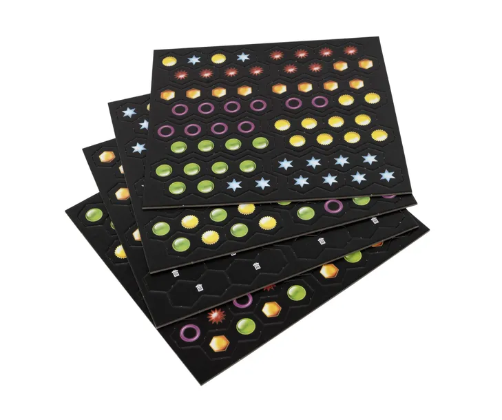 In more detail, the game includes 120 domino-style tiles, each consisting of two conjoined hexes; each hex has one of six colors in it, with most tiles having different-colored hexes. Each player has a rack with six tiles on it, and on a turn a player places one tile from their rack onto two hexes of the game board. For each hex on this tile, they score one point in that color for each hex of the same color that lies adjacent to it and each hex in a straight line from it. If a player brings the score of a color to 18, they immediately take another turn. At the end of their turn, they refill their rack to six tiles. (Before refilling their rack, if they have no tiles on it that contain hexes in their lowest-scoring color, they can discard all of their tiles, then draw six new tiles from the bag.)