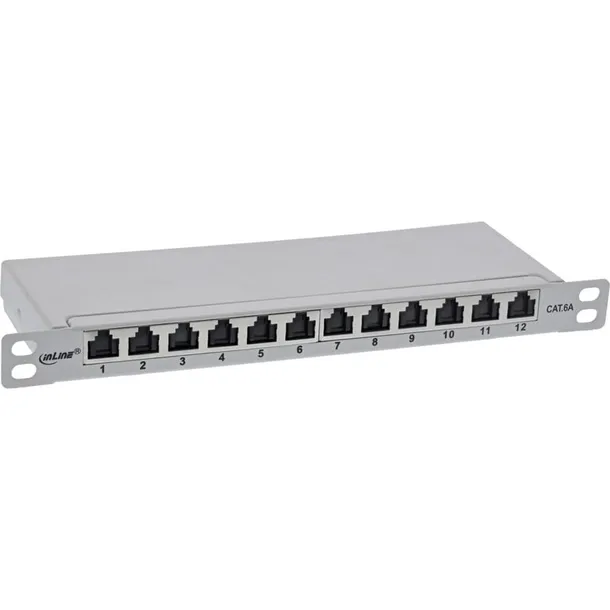InLine 76819A. Złącze(a): RJ45, Obsługiwane typy kabli: Cat6a. Kolor produktu: Szary, Typ montażu: Montaż półkowy, Pojemność stelaża: 0.5U. Wysokość produktu: 23 mm. Rodzaj opakowania: Pudełko