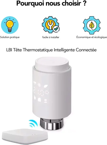 - Zawór grzejnikowy: podłączona głowica termostatyczna umożliwia regulację temperatury podłączonych grzejników ręcznie lub zdalnie za pośrednictwem aplikacji.