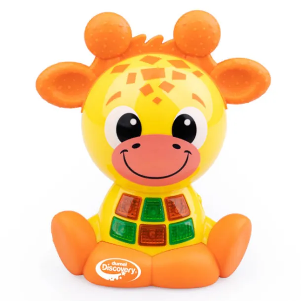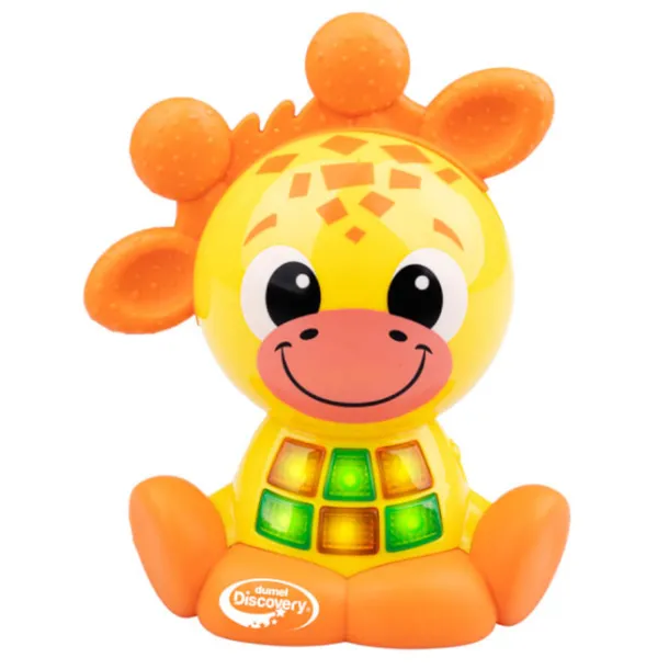 Niewielki rozmiar, bogate wnętrze! Mądra żyrafka uczy maluchy cyferek i śpiewa dwie edukacyjne piosenki. Zwierzak odtwarza aż 25 różnych dźwięków i melodii, z którymi zabawa stanie się jeszcze weselsza! Na brzuszku żyrafy znajdują się przyciski, aktywujące światełko i poszczególne dźwięki. Uszka zwierzaka także wydają odgłos, a jest nim terkotanie, które dziecko usłyszy za każdym razem, gdy przekręci je w prawą lub w lewą stronę. Produkt przeznaczony jest dla dzieci od 2 roku życia.