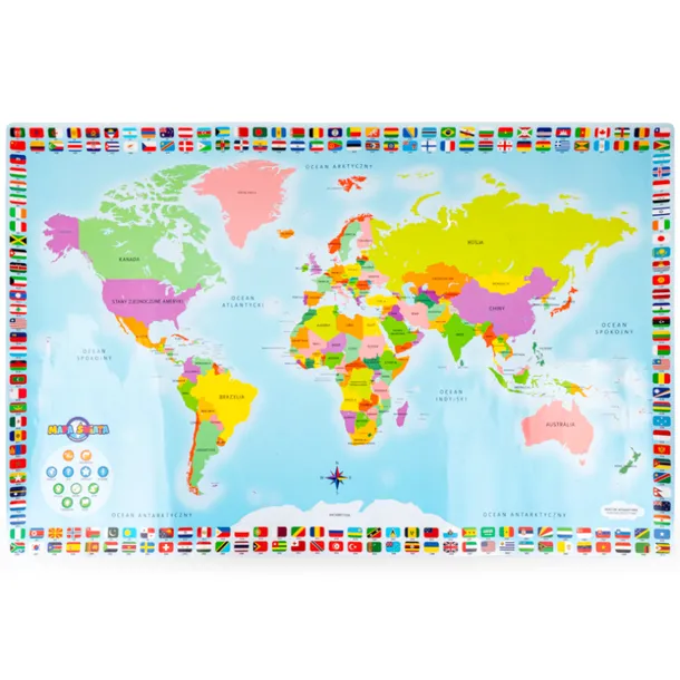 Zapraszamy na podróż dookoła świata… długopisem po mapie! Ten odlotowy, edukacyjny zestaw kryje w sobie kolorową mapę oraz interaktywny długopis w kształcie samolotu, który aktywuje dźwięki, pozwalając małym podróżnikom na odkrywanie oceanów, państw i ich flag. Na mapie znajdują się aktywne pola, które w połączeniu z interaktywnym długopisem z zestawu opowiadają o państwach, przekazując różne informacje oraz ciekawostki na ich temat. Zabawka jest dwujęzyczna (polsko-angielska), dzięki czemu po przyswojeniu wiedzy w języku polskim, dziecko może ćwiczyć znajomość języka obcego, próbując swych sił w wersji anglojęzycznej. Do wyboru są cztery tryby zabawy. Pierwszy (Odkrycie) to tryb nauki, w którym słuchamy nazw i informacji, trzy kolejne (Quiz, Super Quiz oraz Wyzwanie), to tryby rozrywki, w których można sprawdzić swoją wiedzę, odpowiadając na pytania. Quiz oraz Super quiz umożliwiają grę solo, a tryb Wyzwanie – emocjonującą rozgrywkę w duecie. Produkt przeznaczony jest dla dzieci od 6 roku życia.