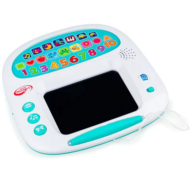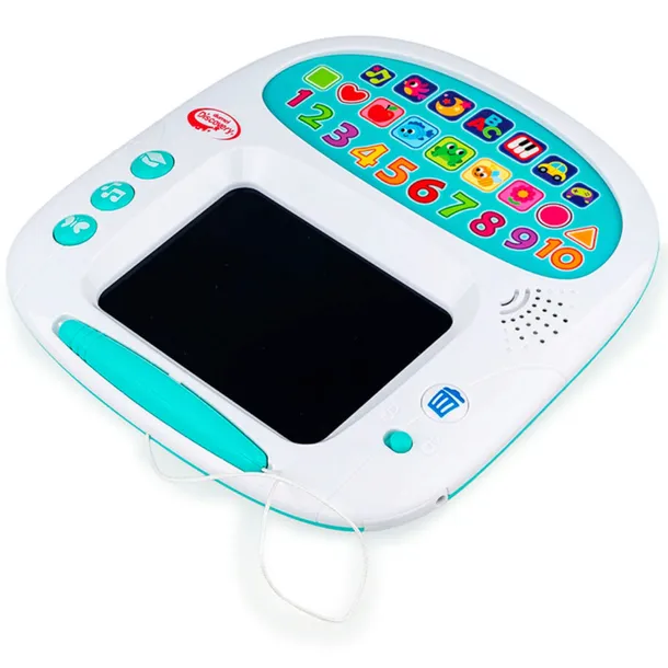 Ta edukacyjna tablica bawi, edukuje, a nawet inspiruje artystycznie! Zabawkę tworzy panel dźwiękowy, wyposażony w kolorowe przyciski z obrazkami, oraz tablica do rysowania. Kolorowe obrazki uczą liczenia, kolorów, kształtów, a także bawią grą w zgadywanie. Znajdziemy tu także wesołe melodie i zabawne dźwięki. Obok tablicy, stanowiącej przestrzeń do artystycznych improwizacji dziecka, znajdują się trzy dodatkowe przyciski, które aktywują wskazówki do rysowania oraz piosenki w języku polskim. Tablica wyposażona została w niezwykle przydatną funkcję blokady zmazywania, co pozwala zapobiec przypadkowemu usunięciu obrazka, narysowanego za pomocą dołączonego rysika.