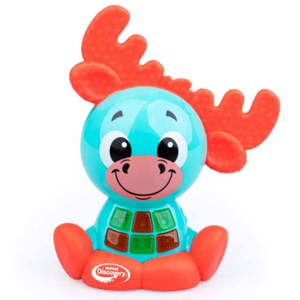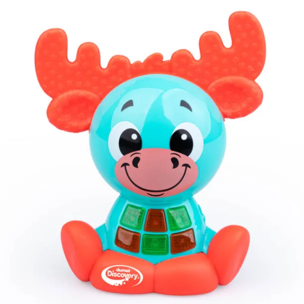 Ten wesoły gagatek to niezły bystrzak! Zna cyferki i dwie piosenki edukacyjne, które na pewno spodobają się najmłodszym. Łoś odtwarza aż 25 dźwięków i melodii, które urozmaicą zabawę. Jego brzuszek zdobią przyciski, aktywujące poszczególne dźwięki oraz światełka. Łosiowe poroże także wydaje dźwięk, a jest nim terkotanie, które maluch usłyszy za każdym razem, gdy przekręci poroże w prawą lub w lewą stronę. Produkt przeznaczony jest dla dzieci od 2 roku życia.