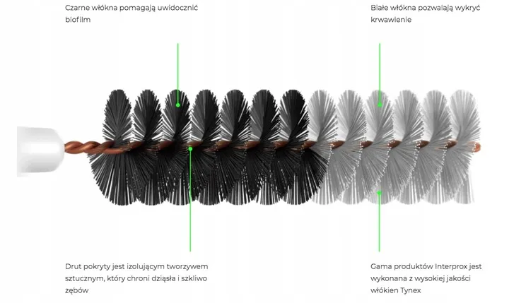 Te szczoteczki gwarantują delikatność i bezpieczeństwo dzięki drutowi ze stali nierdzewnej pokrytemu poliuretanem, co minimalizuje ryzyko urazów dla zębów, implantów czy aparatu ortodontycznego. Wygięta pod kątem główka ułatwia dostęp do tylnych obszarów, umożliwiając dokładną pielęgnację bez podrażnień, co przekłada się na niezawodną rutynę higieniczną w każdym zakamarku jamy ustnej.