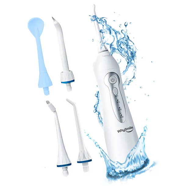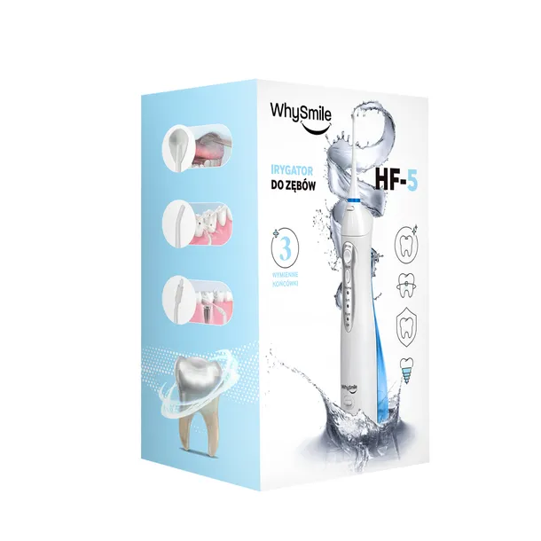✅MOCNY Irigator do Zębów WhySmile - Dentystyczny BEZPRZEWODOWY, 3 Tryby, 4 Dysze, Wodoodporny, Elektroniczny, Higiena Jamy Ustnej Zdobądź Perfekcyjny Uśmiech Już Dziś! Profesjonalny Irygator do Zębów od Marki WHYSMILE Tryby Pracy: Tryb SOFT: Oferuje delikatne ciśnienie, idealne dla wrażliwych dziąseł i osób z nadwrażliwością. Zapewnia komfortowe czyszczenie przy niskim ciśnieniu wody. Tryb NORMAL: Standardowe ciśnienie, powszechnie wybierane przez większość użytkowników, gwarantuje skuteczne usuwanie resztek pokarmowych i bakterii. Tryb PULSE: Zapewniający codzienny masaż dziąseł, pomaga w wzmacnianiu dziąseł oraz redukcji krwawienia, oferując intensywne i pulsacyjne czyszczenie. Końcówki: 2x Standardowa Końcówka: Idealna do dokładnego czyszczenia przestrzeni międzyzębowych i linii dziąseł, usuwając resztki jedzenia oraz płytkę nazębną. 1x Końcówka Ortodontyczna: Specjalnie zaprojektowana do dokładnego oczyszczania obszaru wokół aparatu dentystycznego, zapewniająca dogłębne czyszczenie. 1x Skrobak do Języka: Skutecznie usuwa resztki pokarmu i bakterie z powierzchni języka, zapewniając świeżość oddechu i eliminując nieprzyjemne zapachy. Nowoczesne Rozwiązanie dla Codziennej Pielęgnacji Bezprzewodowy irygator WHYSMILE to niezastąpione wsparcie dla kompleksowej pielęgnacji jamy ustnej. Stanowi doskonałe uzupełnienie codziennej rutyny mycia zębów, szczególnie w przypadku posiadaczy szczoteczek sonicznych. Jego ergonomiczny design i lekka konstrukcja są idealne dla podróżujących, umożliwiając skuteczne oczyszczenie przestrzeni międzyzębowych w dowolnym miejscu i czasie. Mobilność w Twoim Zasięgu: Ten bezprzewodowy irygator doskonale sprawdza się w podróży, dzięki wbudowanemu akumulatorowi i kompaktowym wymiarom. Jego funkcjonalność i niska waga umożliwiają wygodne korzystanie zarówno w domu, jak i w podróży. Pełne naładowanie zapewnia nawet 60 minut ciągłej pracy, co wystarcza na miesiąc przy codziennej irygacji przez 2 minuty. Prostota Obsługi i Wygoda Użytkowania: Zarządzanie urządzeniem jest intuicyjne dzięki dwóm przyciskom i wskaźnikowi LED. Dodatkowy przycisk ułatwia szybką wymianę końcówki, a szczelny zbiornik można łatwo i szybko napełnić. Ładowanie jest szybkie i wygodne - trwa zaledwie 4 godziny, a gniazdo ładowania zabezpieczone jest silikonową zaślepką. Odporność na Wodę dla Bezpieczeństwa i Wygody: Irygator jest wodoodporny, zapewniając pełne bezpieczeństwo podczas użytkowania. Szczelny zbiornik o pojemności 150 ml nie tylko chroni urządzenie przed dostaniem się wody, ale także zapewnia wygodę podczas jego używania. Kompletne Wyposażenie w Zestawie: Irygator, Ładowarkę sieciową 4 różnorodne końcówki, spełniające różnorodne potrzeby higieny jamy ustnej, od czyszczenia przestrzeni międzyzębowych po specjalistyczne zabiegi.