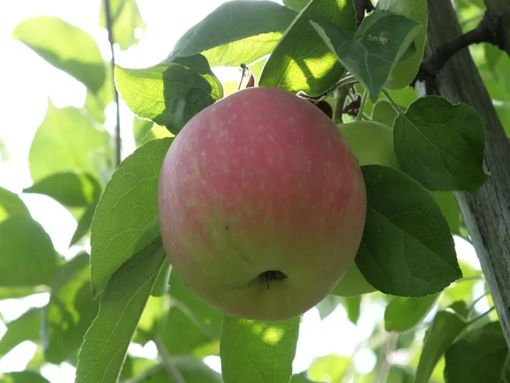 Owoce: Średniej wielkości, kulistospłaszczony, zielonkawożółty, w dużej części pokryty czerwonym, rozmytym rumieńcem.