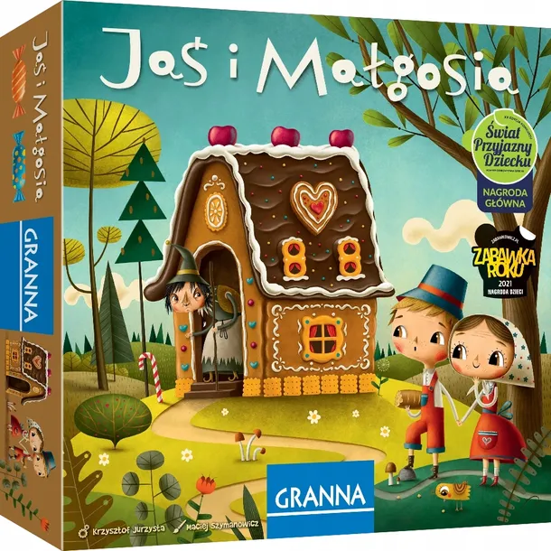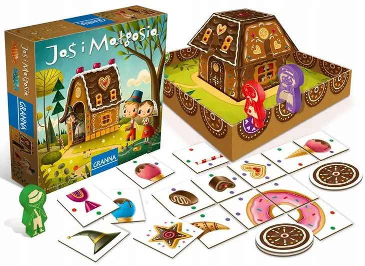 Gra planszowa „Jaś i Małgosia” daje Tobie i Twojemu dziecku jedyną w swoim rodzaju szansę na wejście do świata bajki! I ingerencję w perypetie dobrze znanego rodzeństwa. Przed Wami fantastyczne wyzwanie. Uratujcie Jasia i Małgosię przed zjedzeniem przez Babę Jagę, pomagając im w ucieczce przed tą paskudną czarownicą. Musicie tylko uważać na ukryte kapelusze. To one bowiem dają przewagę wiedźmie. Gotowi na fantastyczną zabawę w rodzinnym gronie? Gra jest przeznaczona dla 4 osób. Wasza rodzina liczy więcej? Niech się przyglądają rozgrywce i Was dopingują — to również da im dużo frajdy. „Jaś i Małgosia” od Wydawnictwa Granna to nietypowa, fantastyczna gra logiczna dla dzieci w wieku od 6 lat. Mogą w nią jednak grać również osoby dorosłe, które lubią spędzać czas ze swoimi pociechami. Dlaczego ta gra jest nietypowa? Gracze bowiem nie mają do czynienia ze zwykłą płaską planszą. Rozgrywka przebiega na trójwymiarowym domku z piernika z ogrodzeniem. Po takiej właśnie konstrukcji poruszają się pionki. I to nie byle jakie! Trzy drewniane figurki przedstawiają bowiem bajkowe postaci: Jasia, Małgosię i Babę Jagę. Gra nie ma kostki. O ruchach decyduje sposób, w jaki zostaną ułożone wylosowane kartoniki. A także to, w którym momencie natrafimy na tajemniczy kapelusz Baby Jagi, który pozwala czarownicy na dodatkowe ruchy. Podczas rozgrywki ważne są przemyślane akcje graczy, którzy mają za zadanie zablokować wiedźmę. Planszówka jest bardzo ciekawa, ponieważ polega na współpracy graczy między sobą. Wszyscy mają jeden cel – ocalić dzieci i zgarnąć żetony z piernikami. Do tego potrzebna jest ścisła kooperacja. Jeśli wygrywać i przegrywać to razem – jako grupa! O to właśnie chodzi w grze Jaś i Małgosia. Dzięki temu mogą w nią grać już nawet pięcioletnie dzieci. Pod czujnym okiem współgraczy na pewno sobie poradzą. Zasady są bowiem bardzo proste, a cele jasno określone. Gra familijna uczy spostrzegawczości i rozwija wyobraźnię. Oprócz tego daje uczestnikom dużo radości. Dlatego też jest świetną propozycją na spędzenie wartościowego czasu z dzieckiem.Zawartość opakowania: • chatka Baby Jagi, • 2 kafelki startowe, • 40 kafelków słodkości, • 8 żetonów pierniczków, • 4 kafelki czapek Baby Jagi, • 3 drewniane pionki, • instrukcja.