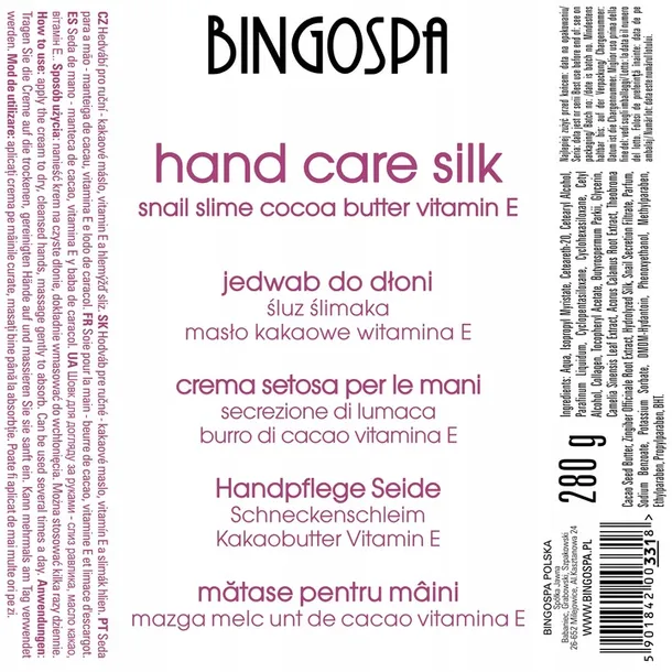 Ten wysokiej jakości jedwab do pielęgnacji rąk i paznokci BINGOSPA o lekkiej konsystencji zapewnia nie tylko przyjemną aplikację, ale także głęboką regenerację. Skrupulatnie opracowana formuła z proteinami jedwabiu, śluzem ślimaka, masłem kakaowym i witaminą E stymuluje naturalne procesy odnowy skóry, przywracając dłoniom gładkość i witalność na co dzień.