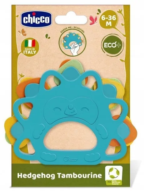 CHICCO JEŻYK TAMBURYN Chicco Jeżyk Tamburyn to urocza grzechotka w kształcie tamburynu, idealna do chwytania i potrząsania przez małe rączki, wprowadzająca dziecko w świat pierwszych dźwięków. Ten kolorowy i atrakcyjny instrument muzyczny nie tylko zapewnia rozrywkę, ale także wspiera rozwój sensoryczny i umiejętności poznawcze najmłodszych. Funkcje: - Delikatne grzechotanie: Potrząsając tamburynem, dziecko usłyszy delikatne grzechotanie, które zachwyca i bawi, wspomagając rozwój umiejętności słuchowych.- Rozwój koordynacji manualnej: Zabawka pomaga w rozwijaniu koordynacji manualnej i motorycznych umiejętności dziecka.- Plastik z recyklingu: Wykonana z 75% recyklingowanego plastiku pochodzącego z odpadów przemysłowych i bioplastiku pochodzenia roślinnego, zabawka jest przyjazna dla środowiska. Opakowanie zabawki nadaje się do recyklingu i wykonane jest z papieru certyfikowanego przez FSC(R), wspierając ochronę lasów i bioróżnorodności.- Ergonomiczny uchwyt: Ergonomicznie zaprojektowany uchwyt umożliwia wygodne trzymanie tamburynu przez małe rączki dziecka, co sprzyja rozwijaniu zdolności motorycznych i koordynacji ruchowej.- Bezpieczne wykonanie: Tamburyn został wykonany z wysokiej jakości, bezpiecznych materiałów, które są odpowiednie dla delikatnej skóry dziecka. Zaokrąglony kształt tamburyna sprawia, że jest on bezpieczny w użytkowaniu, nie stanowiąc zagrożenia podczas zabawy.- Nauka gry na instrumencie: Tamburyn jest doskonałym narzędziem do wprowadzenia dzieci w świat muzyki. Dzięki przyjemnym dźwiękom i możliwości grzechotania, dzieci uczą się podstaw rytmu i melodyki, rozwijając swoje umiejętności muzyczne od najmłodszych lat.- Kolory i interakcja: Żywe kolory zabawki przyciągają uwagę dziecka i zachęcają je do interakcji z instrumentem, stymulując rozwój zmysłu wzroku i koordynację ręka-oko.- Nauka poczucia rytmu: Grzechotanie i uderzanie w tamburyn pozwala dzieciom odczuć rytm i tempo muzyki, rozwijając umiejętności rytmiczne, co może być przydatne w dalszym rozwoju muzycznym dziecka. Dane Techniczne: Wymiary Zabawki: 15 x 12 x 2 cmWymiary Opakowania: 21,5 x 2,5 x 14 cmGrupa Wiekowa: 6-36 miesięcy Zabawki Chicco ECO+Wszystkie zabawki z linii Chicco ECO+ są wykonane z plastiku pochodzącego z recyklingu i bioplastiku. Cechuje je bezpieczeństwo i trwałość. Chicco troskę o środowisko wyraża zarówno poprzez proces opracowywania produktów, jak i opakowań, które nadają się do recyklingu i są wykonane z papieru pochodzącego z lasów odpowiedzialnie zarządzanych. Chicco Jeżyk Tamburyn to idealna zabawka dla najmłodszych, która nie tylko bawi, ale także wspomaga ich rozwój sensoryczny i motoryczny. Dzięki solidnej konstrukcji i starannemu wykonaniu, jest bezpieczna i trwała, zapewniając wiele godzin radosnej zabawy