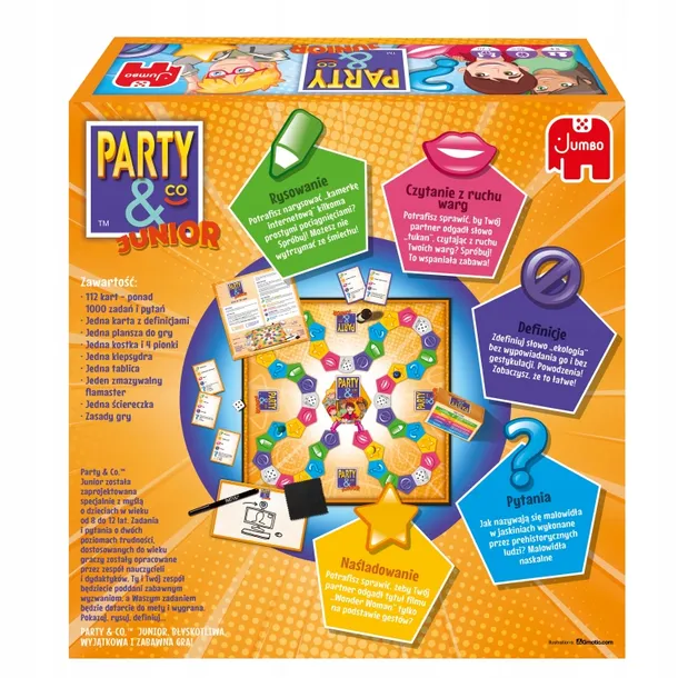 Gra Party & Co. Junior jest specjalnie zaprojektowana dla dzieci w wieku od 8 do 12 lat. Z testami i pytaniami podzielonymi na dwa poziomy trudności, dostosowanymi do wieku graczy, napisanymi przez zespół nauczycieli i edukatorów. Ty i twój zespół będziecie musieli przejść zabawne testy, które znajdziesz po drodze i być pierwszym, który dotrze do mety, aby wygrać.