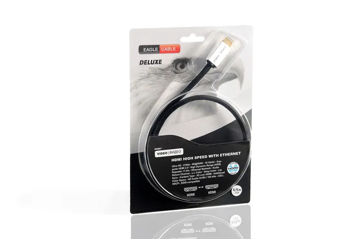 Eagle Cable DELUXE HDMI II Generacji produkowany jest z miedzi beztlenowej OFC, trzykrotnie ekranowany, jest w pełni zgodny ze standardem HDMI 2.0