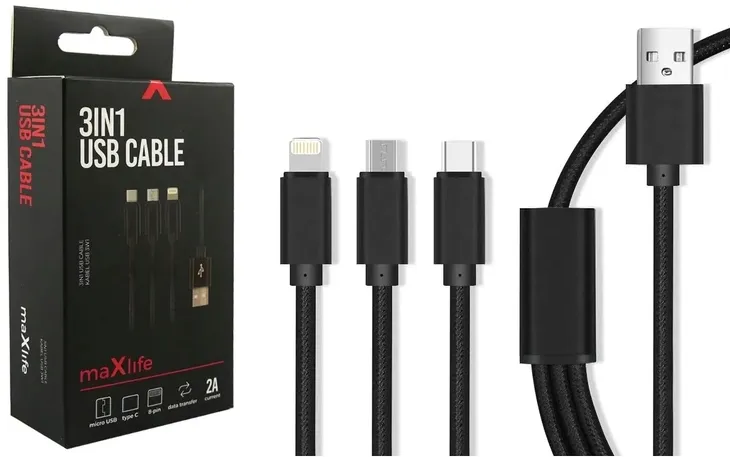 Uniwersalny kabel USB marki Maxlife 3w1 ze złączem 8-PIN. Kabel posiada trzy złączaMicro USB / USB typ-C / 8-pin, dzięki czemu jednym kablem możesz ładować wiele różnych urządzeń z jednego źródła mocy.
