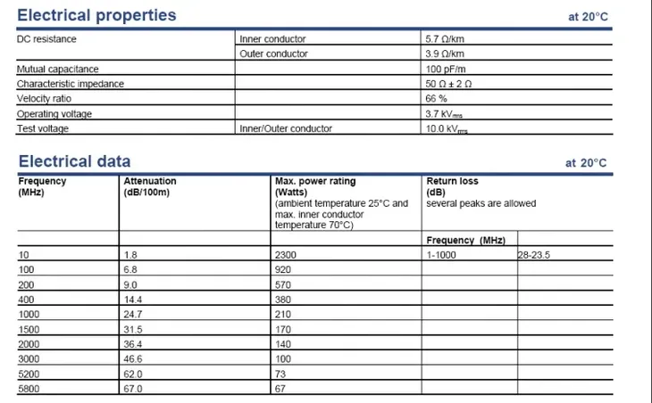- Rezystancja dla prądu stałego - żyła wew./żyła zew. (Ohm/km): 6,0 / 4,2