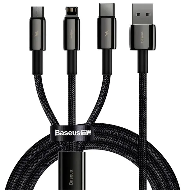 Uniwersalny kabel USB marki Baseus 3w1 ze złączem 8-PIN. Kabel posiada trzy złączaMicro USB / USB typ-C / 8-pin, dzięki czemu jednym kablem możesz ładować wiele różnych urządzeń z jednego źródła mocy. Duży amperaż (3,5 A) zapewnia funkcję szybkiego ładowania 'Fast Charge'.