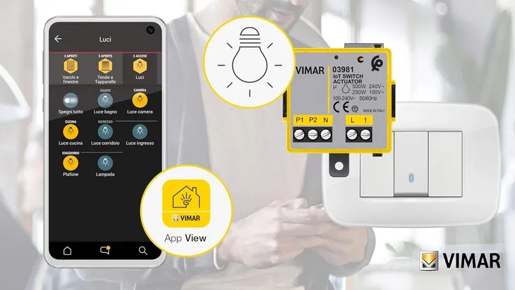 Vimar 03981 Elektroniczne urządzenie sterujące IoT z wyjściem przekaźnikowym NO 100-240 V 50/60 Hz do żarówek 500 W, lampy LED 100W, transformatory elektroniczne 250 VA, świetlówki 120 W, zdalne sterowanie, 1 wejście do sterowania przędzą do wywołania scenariusza, podwójne Technologia IoT na Standard Bluetooth 5.0 do realizacji bezprzewodowego systemu siatki VIEW i standardu Zigbee 3.0, zasilanie 100-240 V 50/60 Hz, montaż wpuszczany (z tyłu)