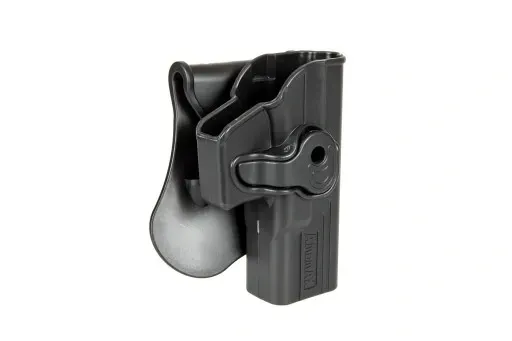 Kabura pistoletowa firmy Amomax, wyprodukowana z trwałego polimeru, nie jest tylko estetycznie wykonana, ale także funkcjonalna. Wyposażona w intuicyjną blokadę, zwalnianą palcem wskazującym podczas dobycia broni, zapewnia płynność i pewność ruchów.