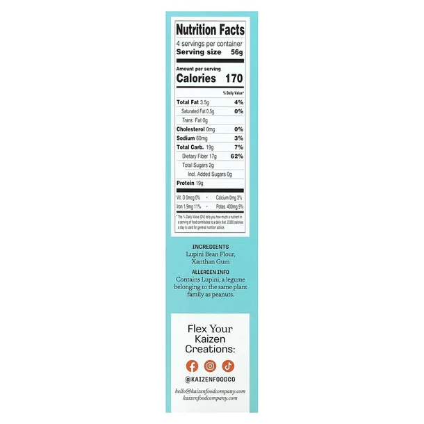 Makaron z ciecierzycyKaizen (jeszcze mniej węglowodanów)Makaron tradycyjny26 g węglowodanów netto2 g węglowodanów netto*39 g węglowodanów netto11 g białka19 g białka7 g białka190 kalorii170 kalorii200 kalorii