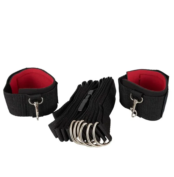 Ekskluzywny 3-częściowy zestaw do krępowania składający się z paska do łóżka i dwóch mankietów z karabińczykami. Pas regulowany do długości 5 metrów, wyposażony w 6 metalowych oczek umożliwiających zaczepienie mankietów w dowolnej odległości. Mankiety od wewnątrz zostały wyściełane miękkim materiałem. Wyposażone w wygodne rzepy umożliwiajace regulację.