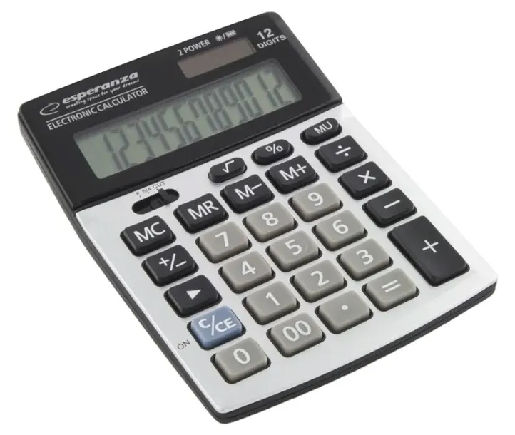 Elektroniczny kalkulator biurkowy z dużym, 12 cyfrowym wyświetlaczem. Posiada wszystkie podstawowe funkcje matematyczne. Pochylony wyświetlacz, duże wyświetlane cyfry oraz duże klawisze ułatwiają pracę z kalkulatorem. Idealny do codziennego użytku w sklepach i biurach.