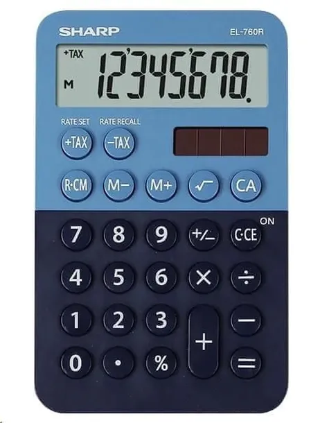 Kompaktowy i lekki kieszonkowy kalkulator. Sharp EL760RBBL do zasilania wykorzystuje baterie i mały panel solarny. Na ekranie pokazuje do 8 cyfr, posiada dodatkowy przycisk TAX +/-, 3 klawisze pamięci lub klawisze %, ?, +/-.