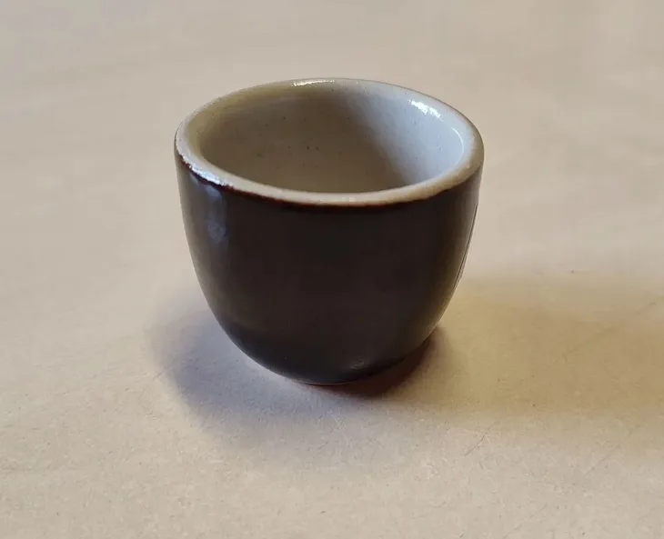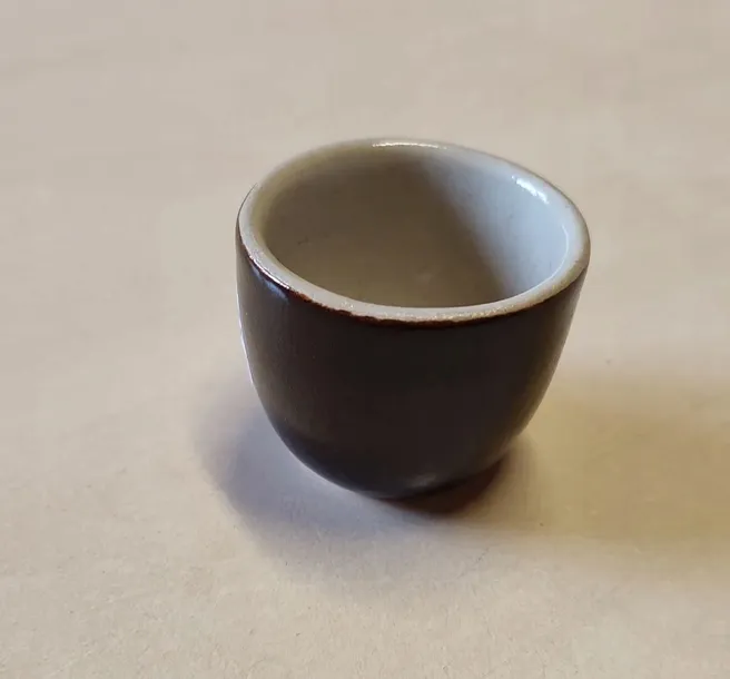 Cechy: - średnica: 5,5 cm - wysokość: 4,5 cm - materiał: ceramika - kolor: beżowy, brązowy