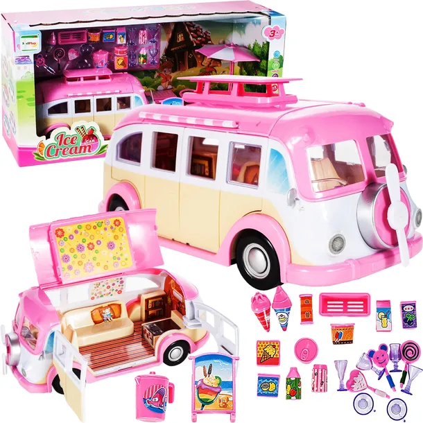 Zaprojektowany w różowym oraz białym kolorze wóz na ruchomych kołach rozkłada się, oferując mnóstwo możliwości zabawy! Dodatkowo posiada otwierane drzwi wraz z oknem, daszkiem i blatem do wydawania słodyczy.