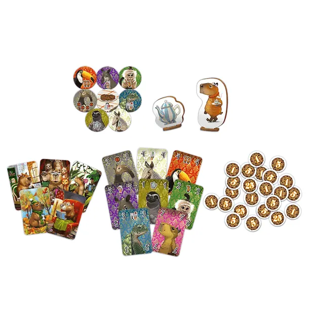 „Kapibary Herbaciary” to pełna uroku i strategicznych intryg gra rodzinna, w której wcielicie się w kapibary urządzające herbaciane przyjęcie dla swoich przyjaciół. Autorem mechaniki gry jest uznany twórca Reiner Knizia, więc możecie być pewni, że rozgrywka dostarczy Wam wspaniałych emocji. Wygra ten z Was, kto dzięki swojemu sprytowi i umiejętnościom planowania, zakończy grę z największą ilością ciasteczek.