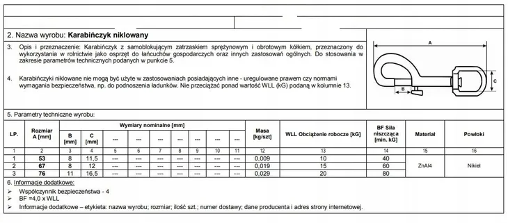 KARABIŃCZYK karabinek NIKLOWANY 67MM