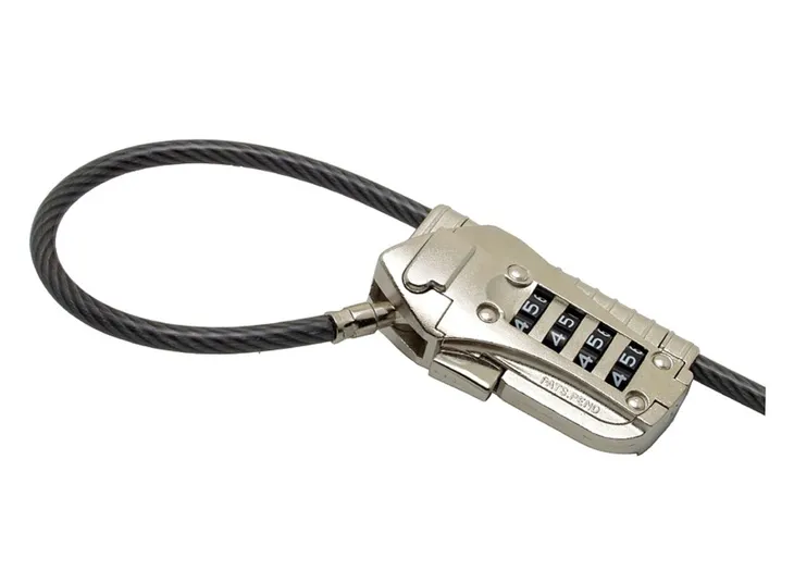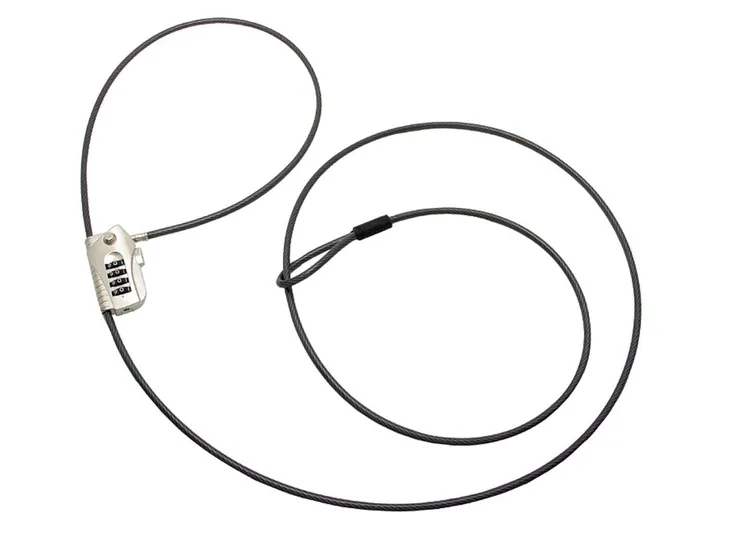 System zamków, który można przymocować do dowolnego przedmiotu na dowolnym podłożu. W komplecie linka stalowa pokryta tworzywem sztucznym z pojedynczą pętlą (długość 2000 mm, średnica 4,8 mm) oraz stalowy zamek z 4-cyfrowym kodem szyfrowym.