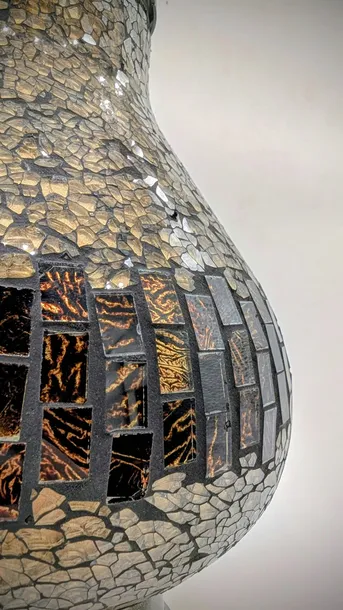 legancki znicz w złoto-brązowej kolorystyce, wykonany ze szkła z dekoracją mozaikową nakładaną ręcznie. Korpus znicza zdobiony jest dwoma rodzajami mozaiki — górna i dolna część pokryta jest drobną, nieregularną mozaiką z kawałków złoto-beżowego szkła, natomiast środkowa część ozdobiona jest regularnie ułożonymi, prostokątnymi kafelkami szklanymi w odcieniach brązu, miedzi i czerni. Przy zapalonym zniczu całość pięknie migoce i przepuszcza ciepłe, bursztynowe światło, tworząc efektowną grę blasku. Plastikowa podstawa oraz pokrywa w kolorze antycznego brązu ze złotym połyskiem nadają zniczowi stonowany, elegancki wygląd, doskonale komponując się z nagrobkami z jasnego i ciemnego kamienia.