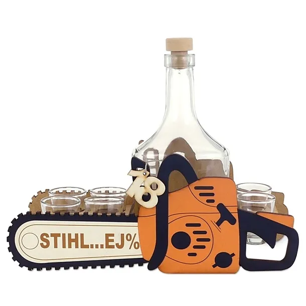 ➯ Elegancja i praktyczność - Szklana karafka z sześcioma kieliszkami, umieszczona na drewnianym stojaku w kształcie piły, to połączenie elegancji i praktyczności. Doskonała propozycja dla miłośników alkoholu.
