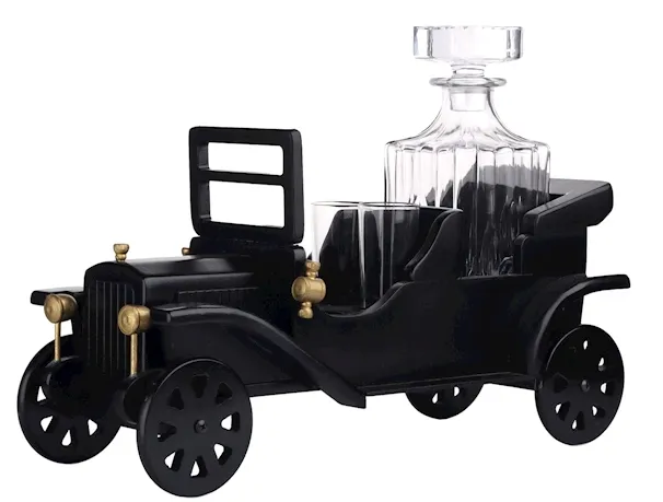 Stojak w kształcie retro samochodu wykonany z drewna zaskakuje swoją dbałością o szczegóły, niektóre elementy pojazdu mają inne kolory, całość zdecydowanie ma elegancki charakter. Szklana karafka i cztery kieliszki dopełniają ten niezwykły stojak i razem tworzą elegancki i oryginalny mini barek. Bez wątpienia jest to wyjątkowy i nietuzinkowy prezent dla miłośników trunków. Wyobrażam sobie, że taki stojak może być nie tylko funkcjonalnym elementem do serwowania ulubionych alkoholi, ale również designerskim dodatkiem, który przyciągnie uwagę każdego.