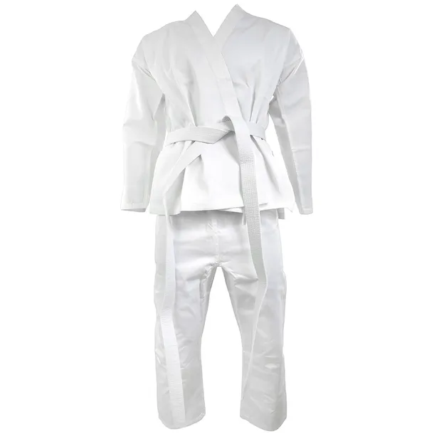 Kimono do karate Profight z paskiem w komplecie to połączanie poliestru i bawełny. Model o klasycznym luźnym kroju, z długimi rękawami i z wiązaniami na bokach. Spodnie z szerokimi i długimi nogawkami, ściągane w pasie troczkami.