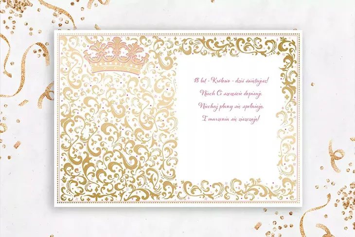 Karnet A5 18 PINK wydrukowany na wysokiej jakości papierze formatu A5. Karnet uszlachetniony złotem i tłoczony. W zestawie koperta. Uszlachetnienie: złoto / tłoczenie Format: A5 Koperta: różowa