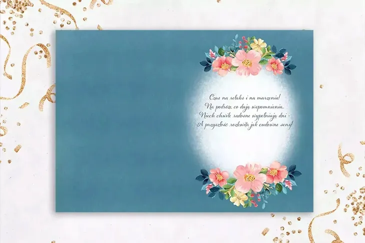 Karnet w formacie A5. Wydrukowany na wysokiej jakości papierze. Karnet ZŁOCONY I TŁOCZONY. W zestawie kolorowa koperta.