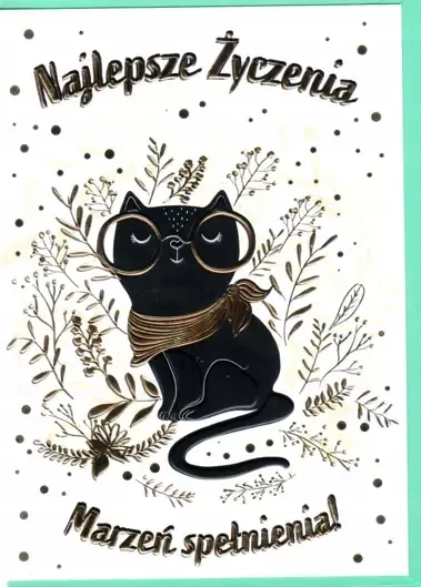 Karnet został wydrukowany na wysokiej jakości papierze. W zestawie znajduje się koperta. Jest uszlachetniony złotą folią i tłoczony, tekst życzeń w środku.