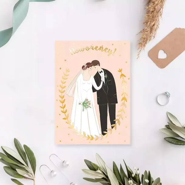 Karnet został wydrukowany na wysokiej jakości papierze. W zestawie znajduje się koperta. Jest uszlachetniony złotą folią i tłoczony, tekst życzeń w środku.