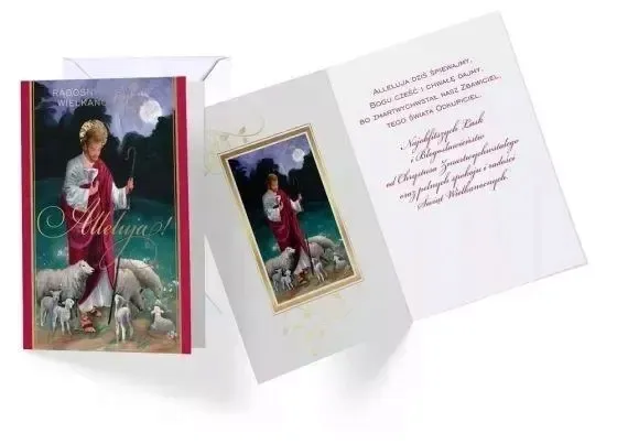 Karnet Wielkanoc Kartka wielkości B6. Karnet wielkanocny, posiada delikatne złote zdobienia. Kartka posiada tekst w środku, dołączona jest do niej koperta.