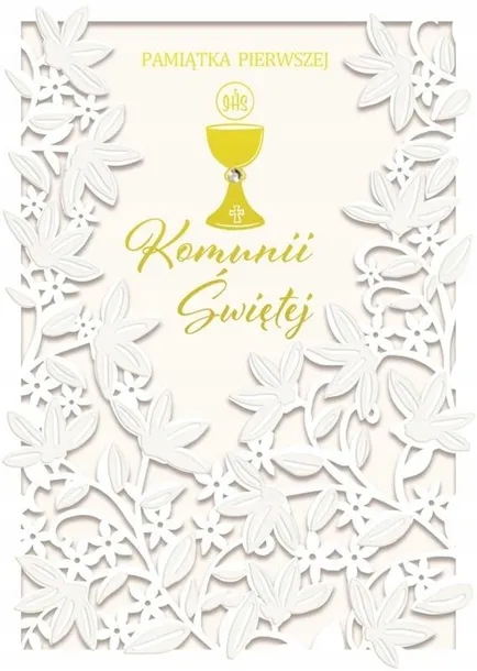 Elegancki karnet na Pierwszą Komunię Świętą w formacie B6 z laserowo wycinanym wzorem. Delikatny, ażurowy motyw z symbolami religijnymi, takimi jak hostia, krzyż czy gołąb. Wewnątrz miejsce na życzenia i dane uroczystości. Idealna pamiątka tego ważnego dnia.