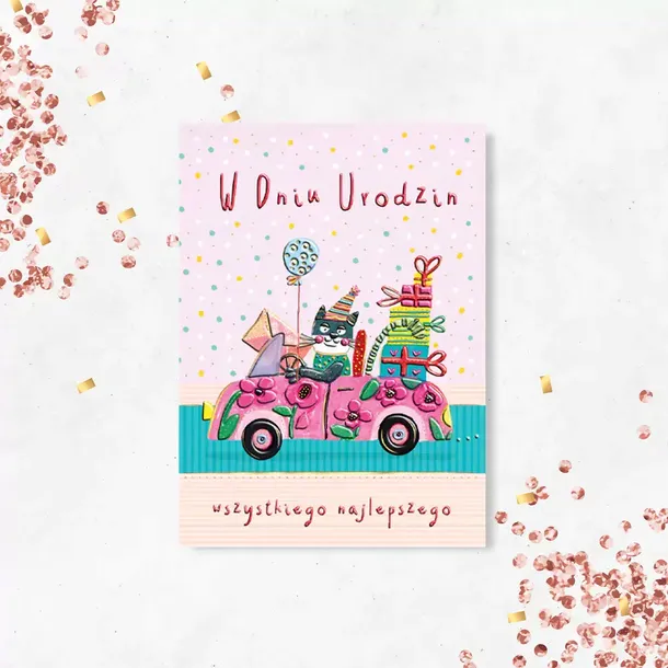 Karnet wydrukowano na wysokiej jakości papierze, uszlachetniono złotem i tłoczeniem. Ozdobne wycięcie po jednej stronie karnetu. W zestawie jest kolorowa koperta.