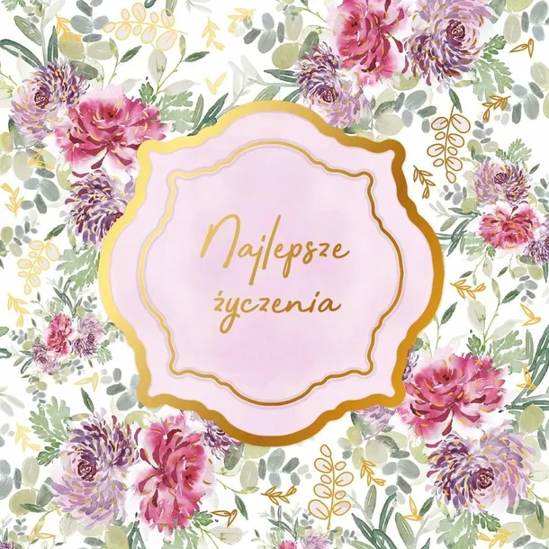 Karnet w formacie 15 x 15 cm. Wydrukowany na wysokiej jakości papierze. Karnet z tłoczonymi wzorami na całej powierzchni oraz złoceniem. W zestawie kolorowa koperta.