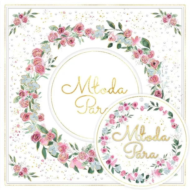 Składany z trzech stron kwadratowy karnet o wymiarach 15 x 15 cm z wyciętym elementem na froncie. Złocony i tłoczony, teksy życzeń w środku. Wydrukowany na wysokiej jakości papierze. W zestawie bilecik do prezentu oraz koperta.