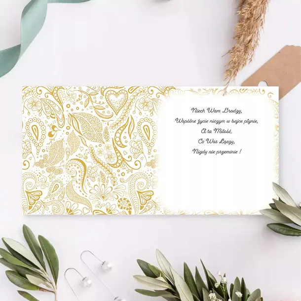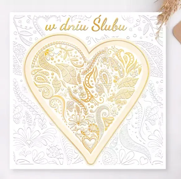 Karnet został wydrukowany na wysokiej jakości papierze. Karnet uszlachetniono złotem i tłoczeniem. W zestawie jest kolorowa koperta. Wymiary: 15.0 x 15.0 cm