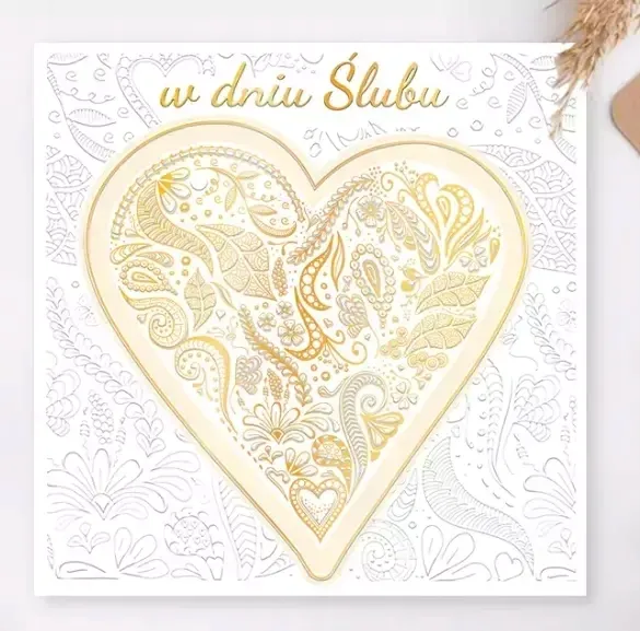 Karnet został wydrukowany na wysokiej jakości papierze. Karnet uszlachetniono złotem i tłoczeniem. W zestawie jest kolorowa koperta. Wymiary: 15.0 x 15.0 cm
