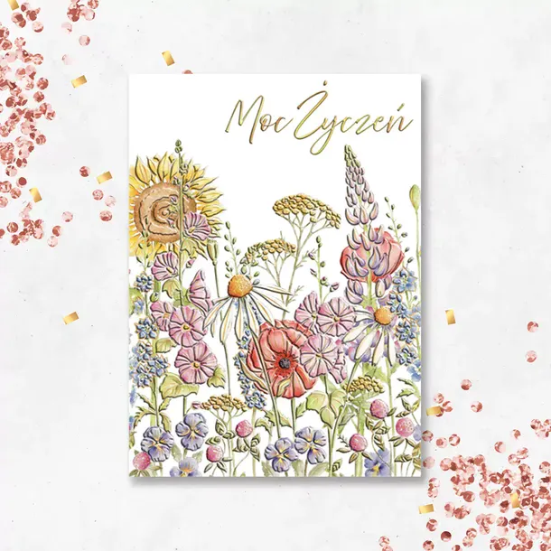Karnet wydrukowano na wysokiej jakości papierze formatu A5. Karnet uszlachetniono złotą folią i tłoczeniem. W zestawie jest koperta.