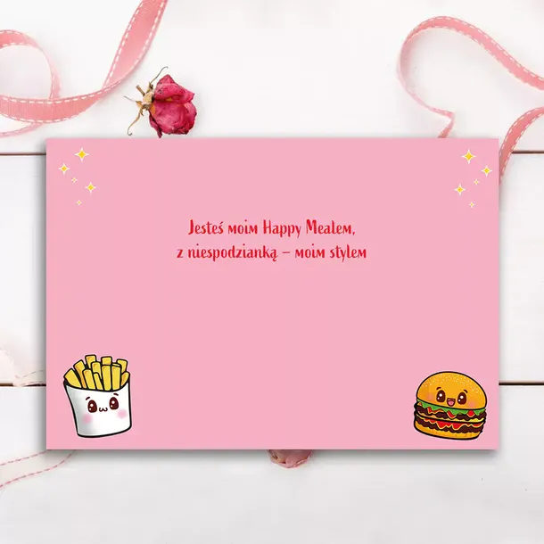 Karnet wydrukowano na wysokiej jakości papierze formatu B6. Karnet uszlachetnionoy czerwoną folią. W zestawie jest kolorowa koperta. Wymiary: 16.3 x 11.9 cm